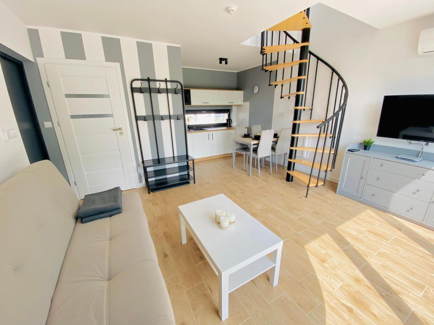 Dom z 2 sypialniami. This air-conditioned holiday home comes with 1 living room, 2 separate bedrooms and 1 bathroom with a shower. Guests will find a stovetop, a refrigerator, a dishwasher and a microwave in the well-equipped kitchenette. The holiday home also includes a barbecue. This holiday home has an electric kettle, a high chair for children, a flat-screen TV and a terrace. The unit has 5 beds. Dom wakacyjny - 6 osobowy. Powierzchnia pokoju ok.: 60 mkw.